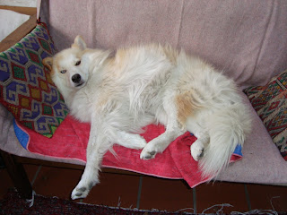 A dono diz-nos que "ela está bem, é uper energética,continua muito amiga do outro cão que tenho! Mando algumas fotos que tirei há uns dias quando a apanho a dormir muito relaxada e sonolenta, embora o estado normal dela seja a correr no quintal e a fazer mil e uma asneiras!! Agora tem mais pelo e o pelo novo nasceu meio amarelado! Está muito gira!